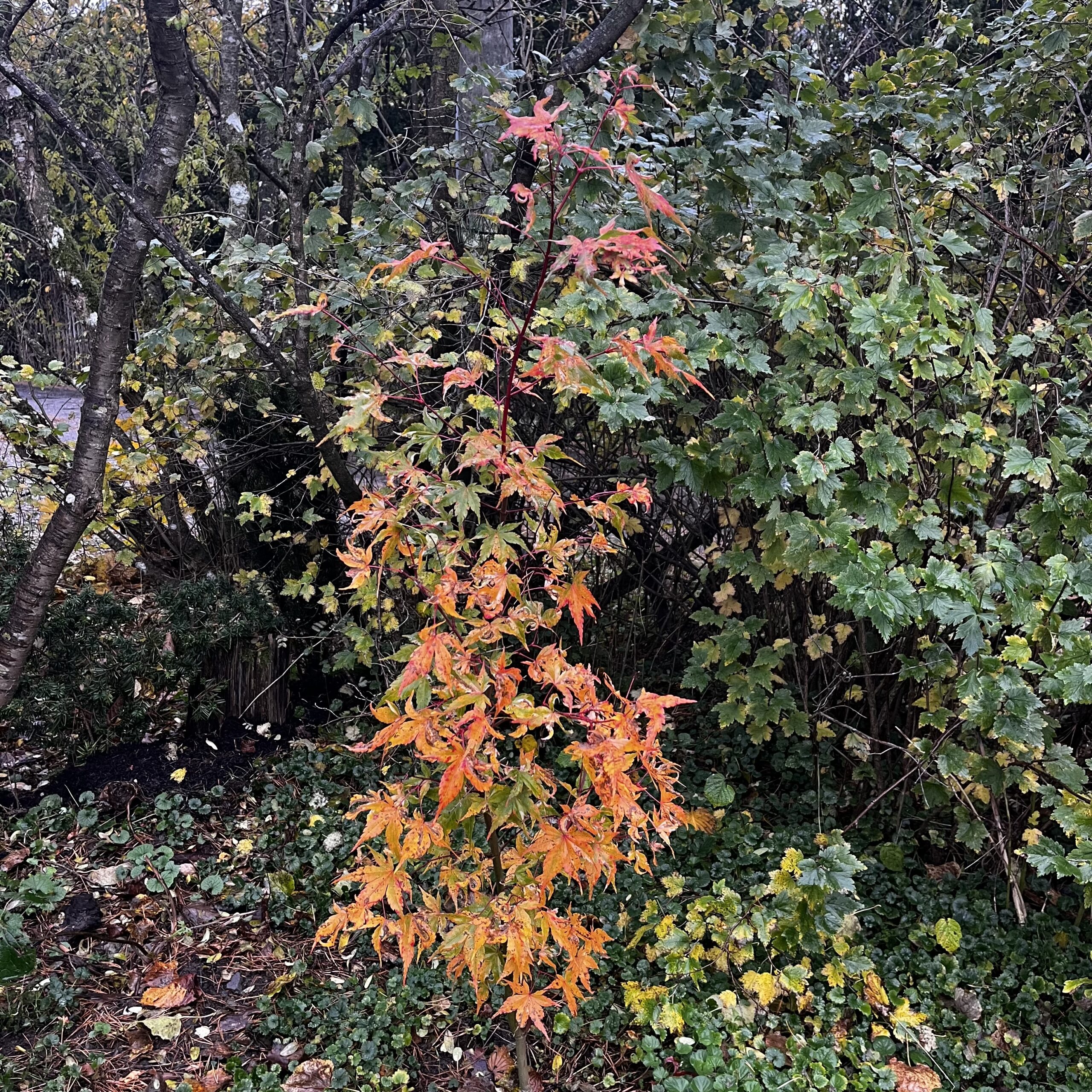 I min nye hage har jeg hverken vanlig lønn eller sibirlønn enda, men et par nydelige japanlønn sto her fra før og jeg har rukket å plante en oppstammet japansk viftelønn. Disse tre har noen dager i oktober hvor de gnistrer herlig i knallrødt eller selvlysende orange.