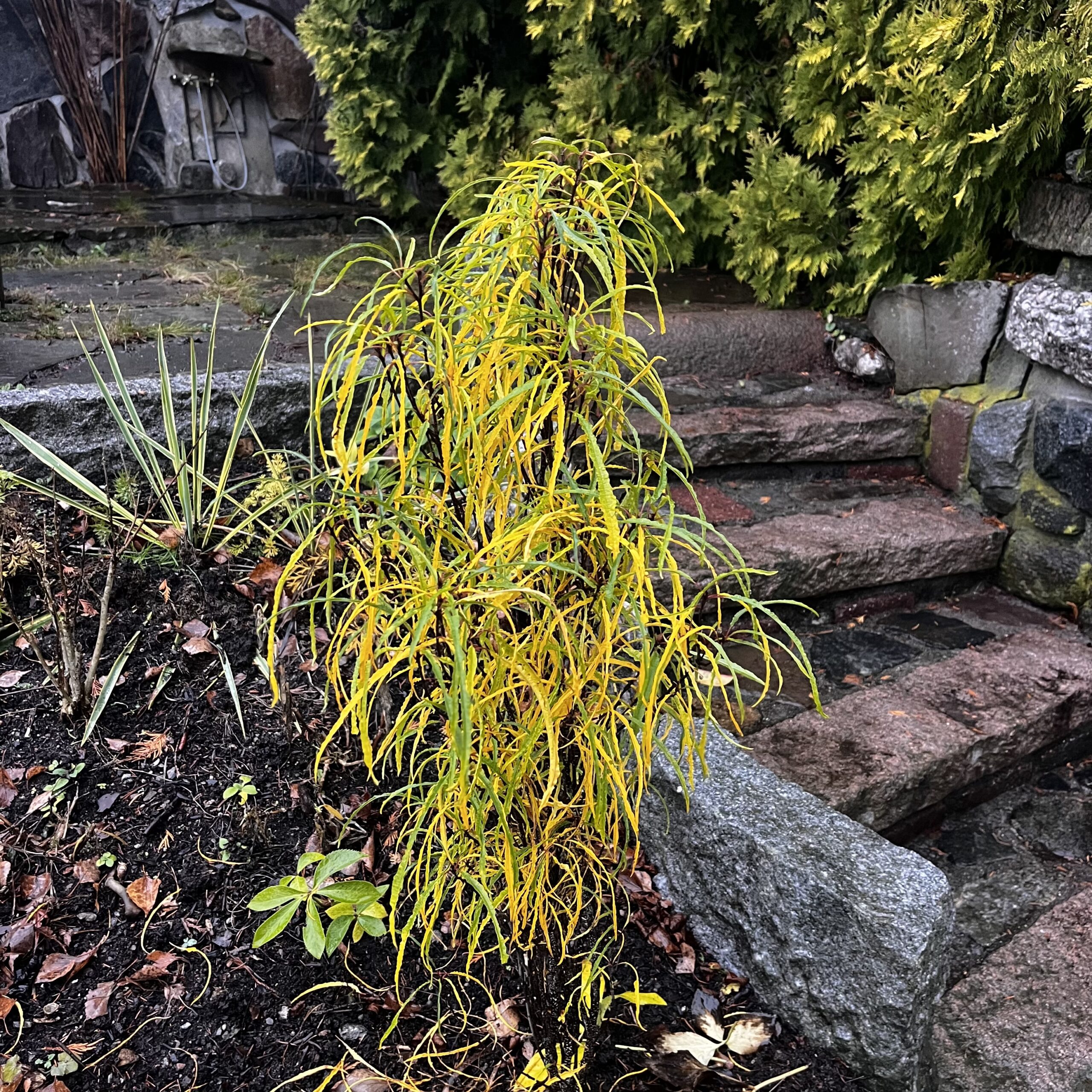 Plantet tidlig 2025 som 40-50cm. Bildene er fra 15. november og 5. desember. Nå måler den 90 cm. Den har nydelige gule høstfarger og den er den som holder lengst på bladene i hele hagen.