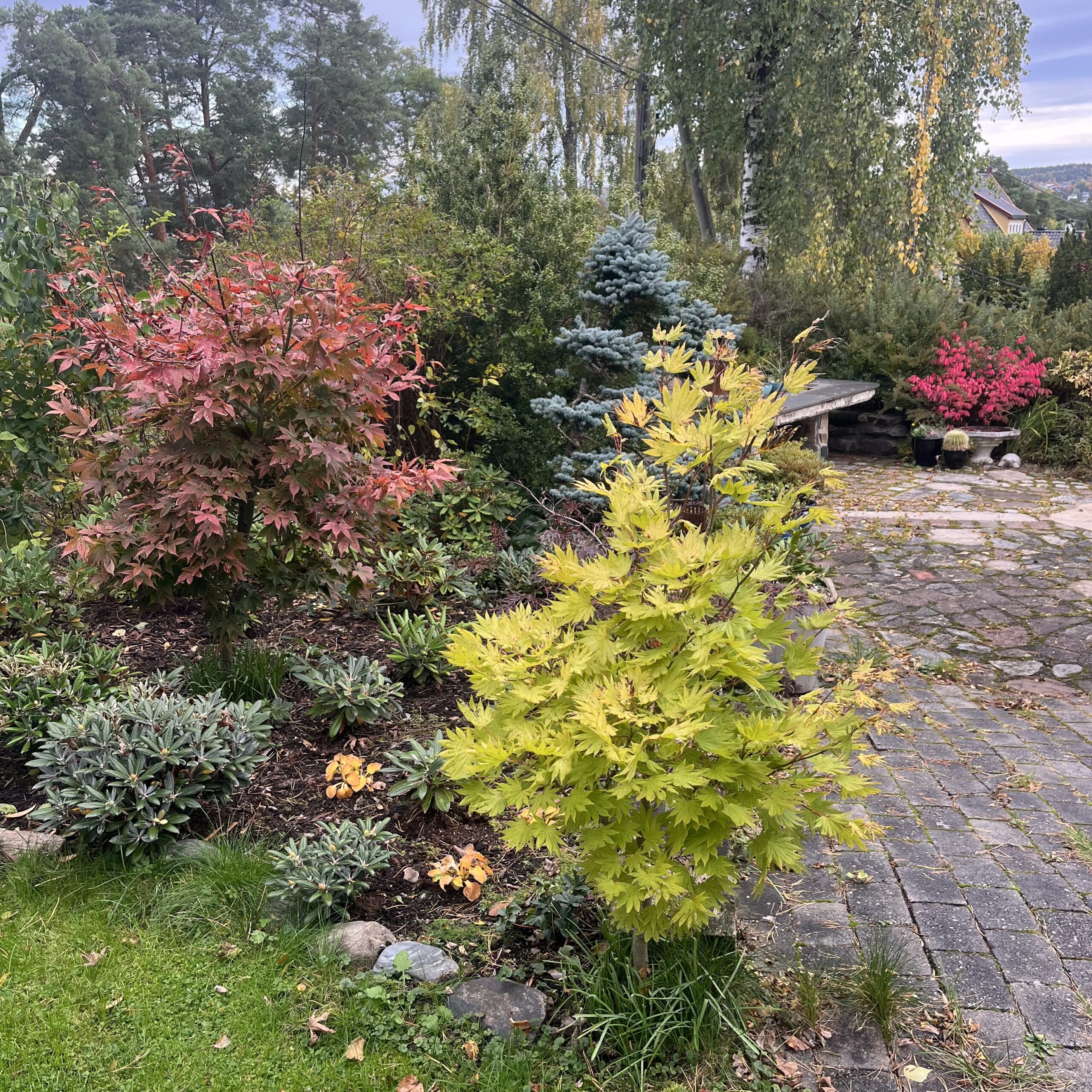 Jeg fikk lyst til å utvide bedet der jeg har en oppstammet viftelønn: Acer palmatum dissectum flavescens (dissectum flavescens betyr: flikete gul). Jeg plantet den som en 1,5 m solitær i oktober for snart 3 år siden. Den blir nok ikke høyere siden den er oppstammet: