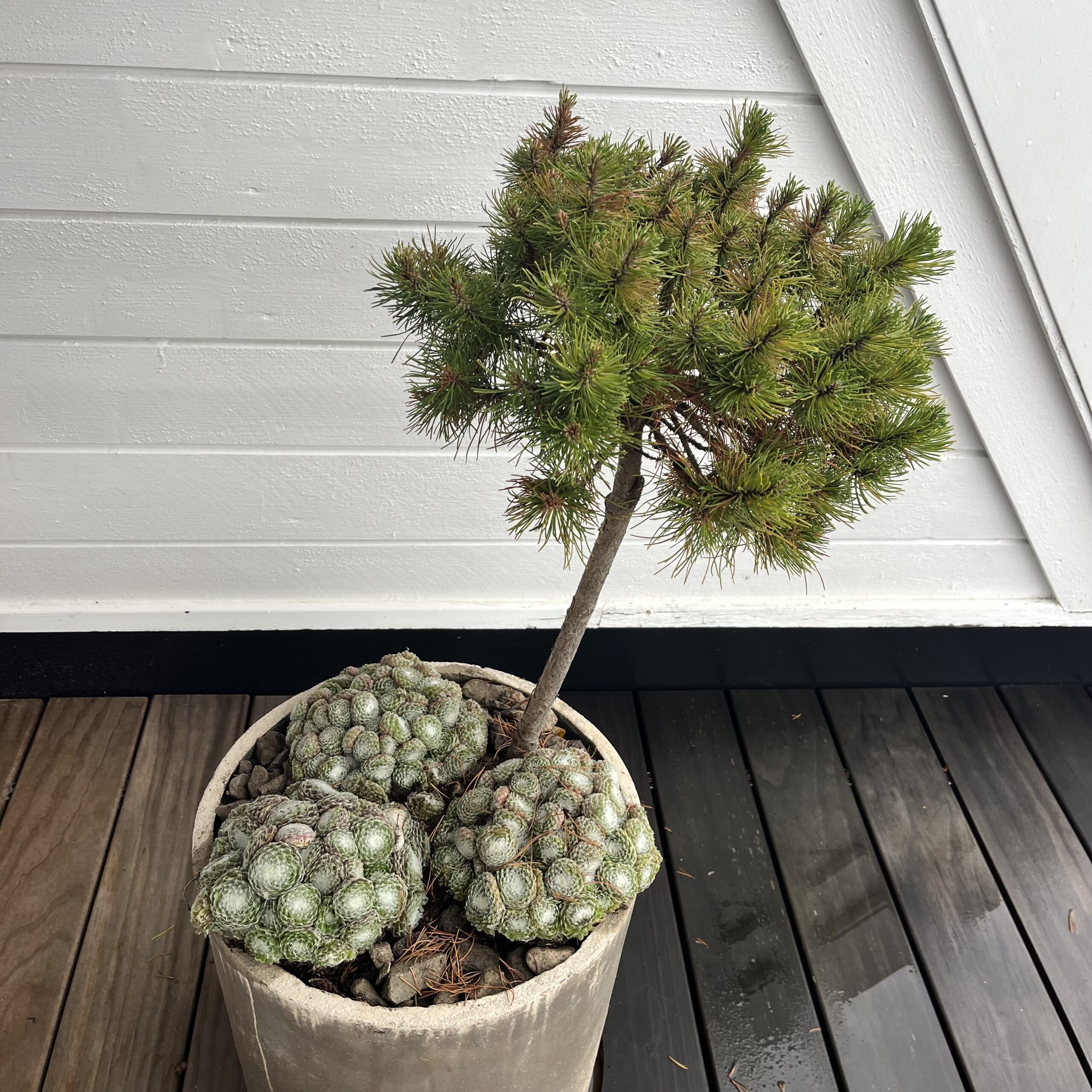 Jeg fikk tak i en nydelig oppstammet furu (Pinus mugo «Winter Gold») som jeg synes egner seg. Den står sammen med en svart gresstype (mørkt ormeskjegg) og en artig knottete sedumplante (Green ball).Vinterpotte