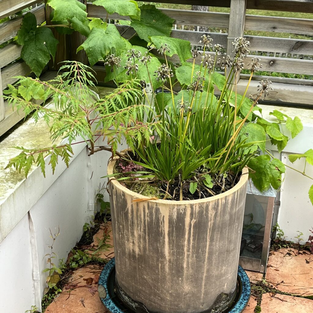 Den andre potten står veldig utsatt for vær og vind, men et par ting fungerer i den: hjortesumak og små blå allium.